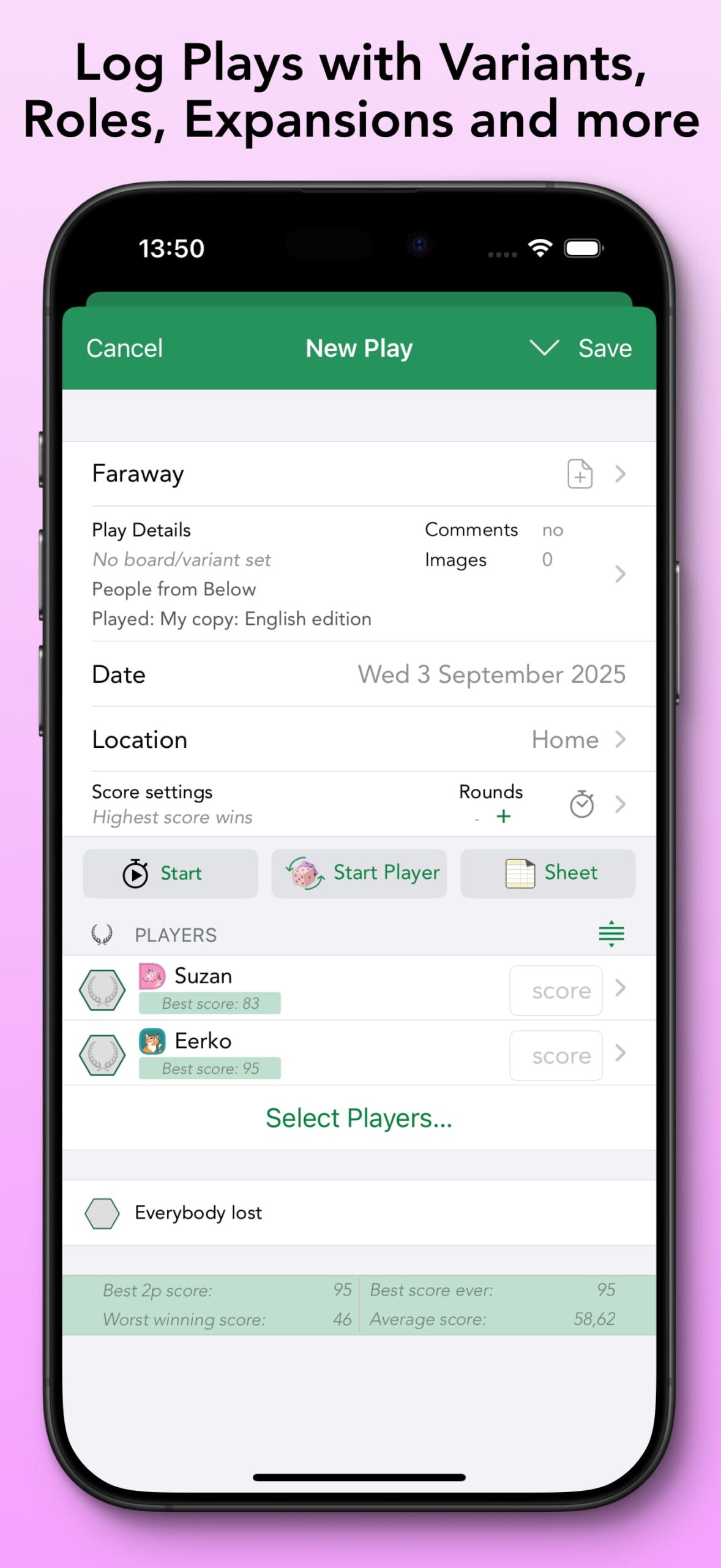 - Post your plays to BoardGameGeek (BGG), including auto-post after each save.